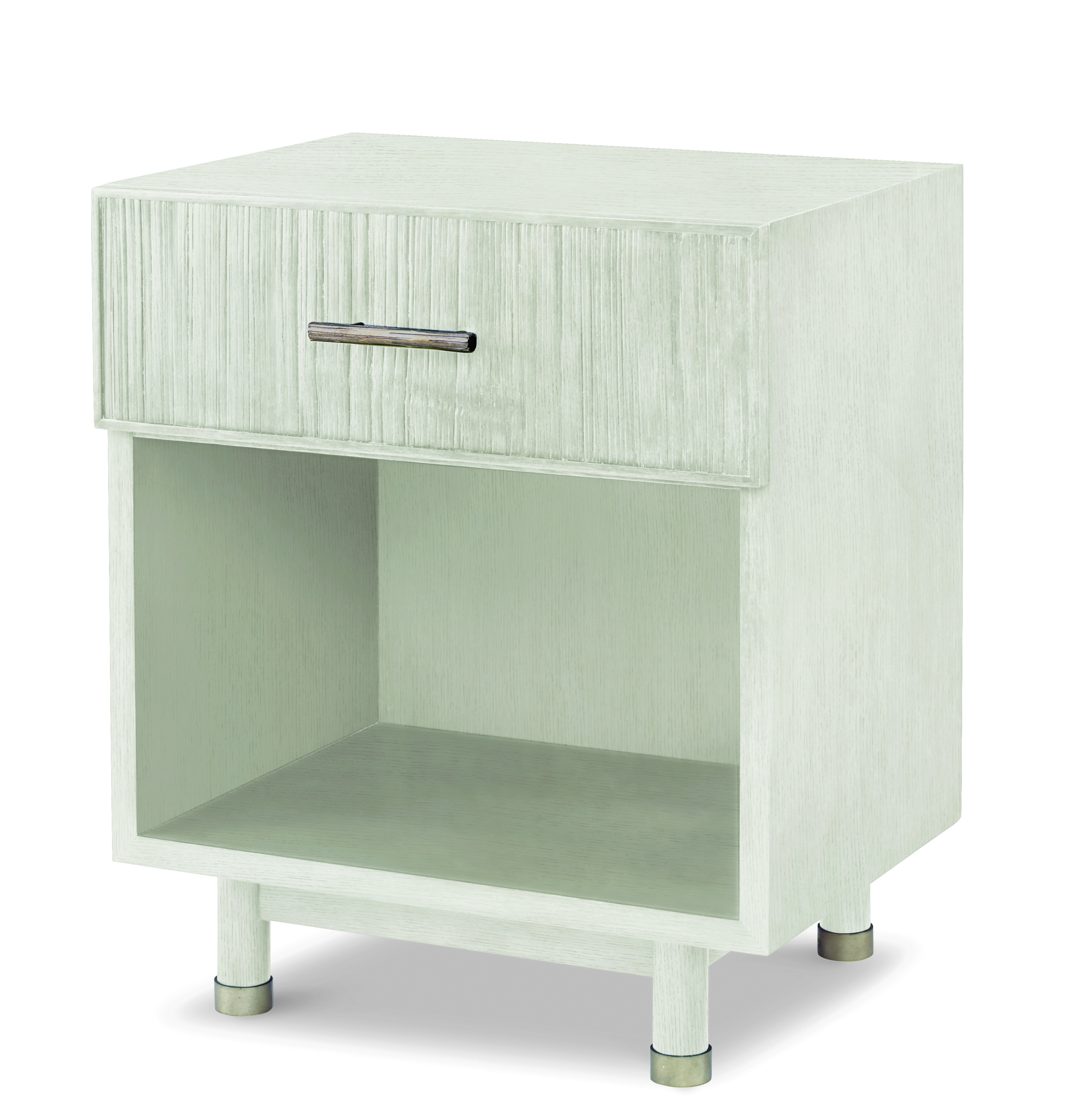 Transitional clean lines, the Biscayne is crafted from Beech solids wrapped in quartered Oak veneers and features a Crushed Bamboo drawer front with cylindrical legs that are capped in pewter ferrules. A textured pewter bar pull centered on the one drawer, above a large opening. Soft close drawer mechanism on the drawer.