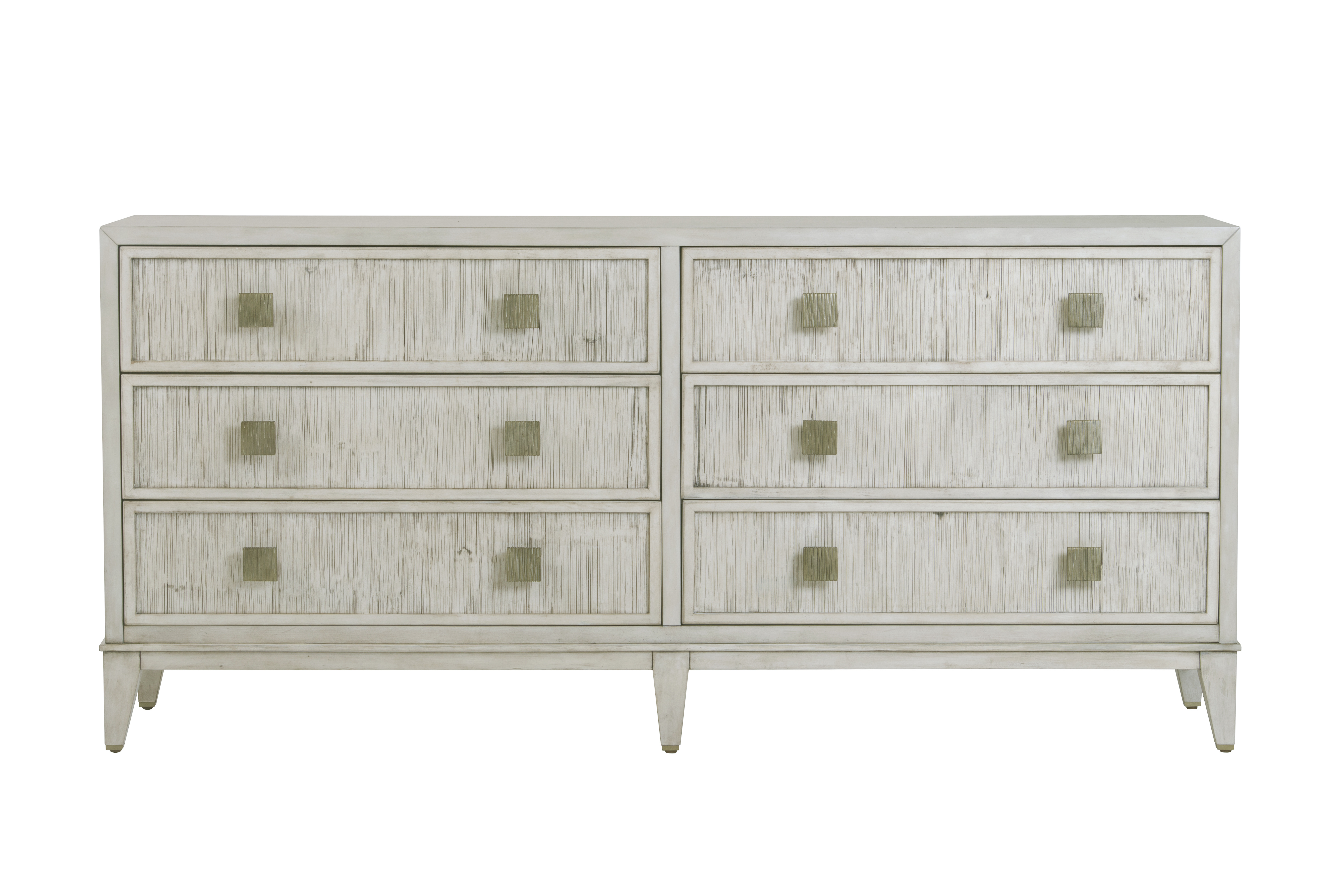 Transitional clean lines, the Carlyle is crafted from Beech solids wrapped in quartered Oak veneers and features Crushed Bamboo drawer fronts with tapered legs. Textured square metal pulls, two on each of the six drawers, all with soft close drawer mechanisms.