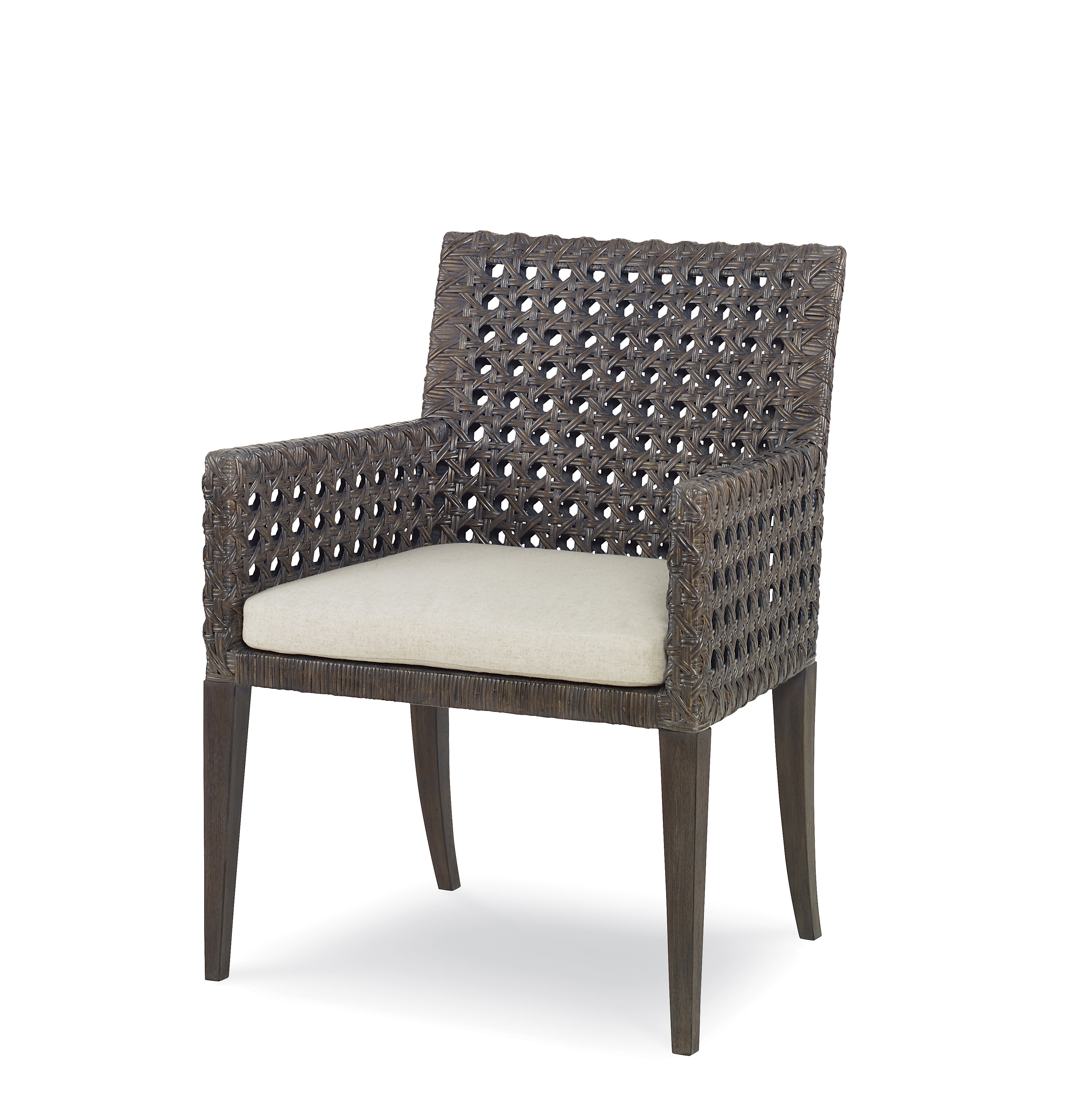 Our Litchfield dining arm chairs is a classic silhouette, with pretty tapered legs and a simple square back and arms. Exceptional here as it is rendered in beautiful mahogany solids with open, woven peel caning all hand applied in a intricate pattern to form the back and arm details. An upholstered seat in linen like flax colored fabric. Also available as a bar and counter stool.