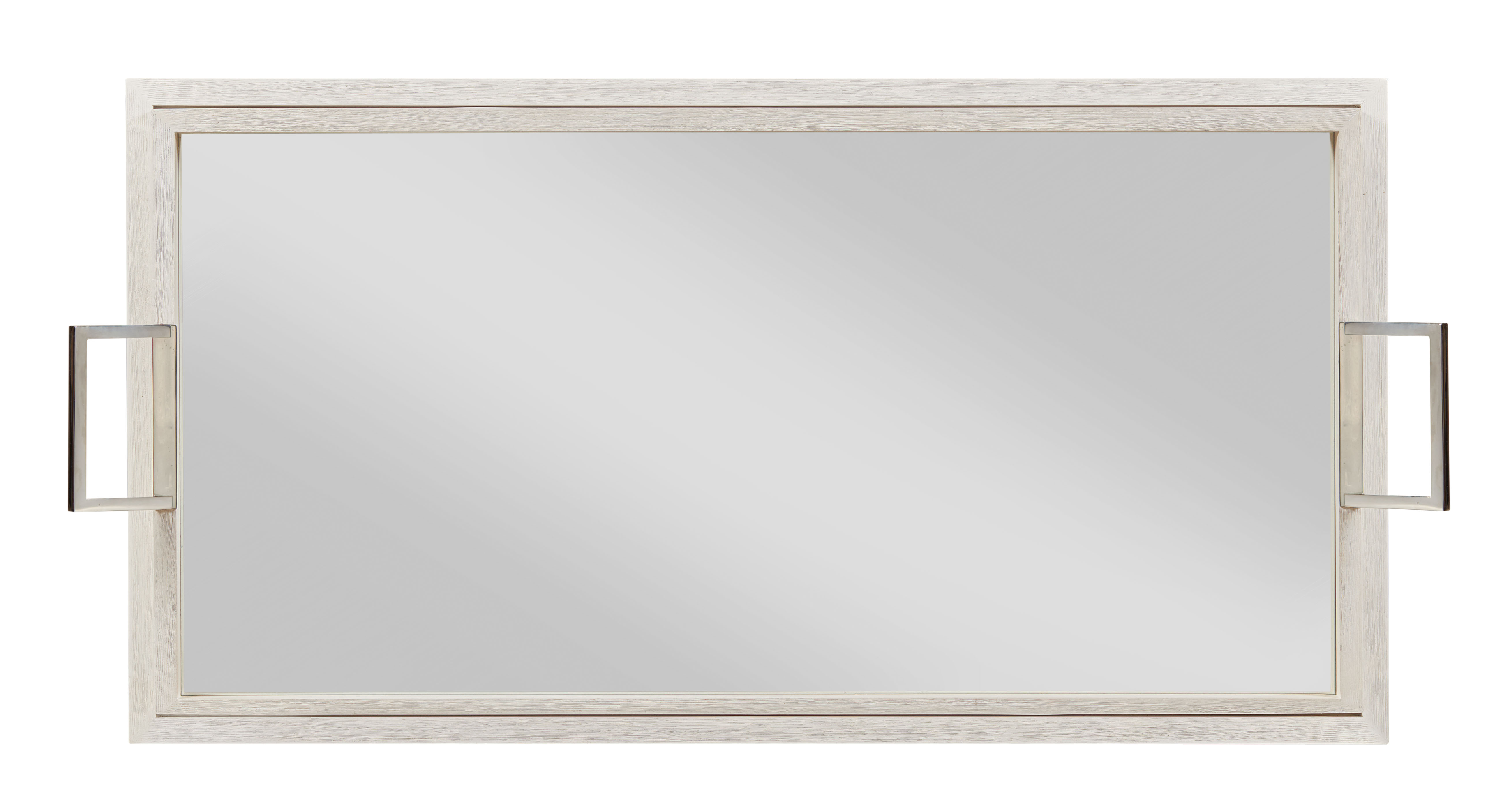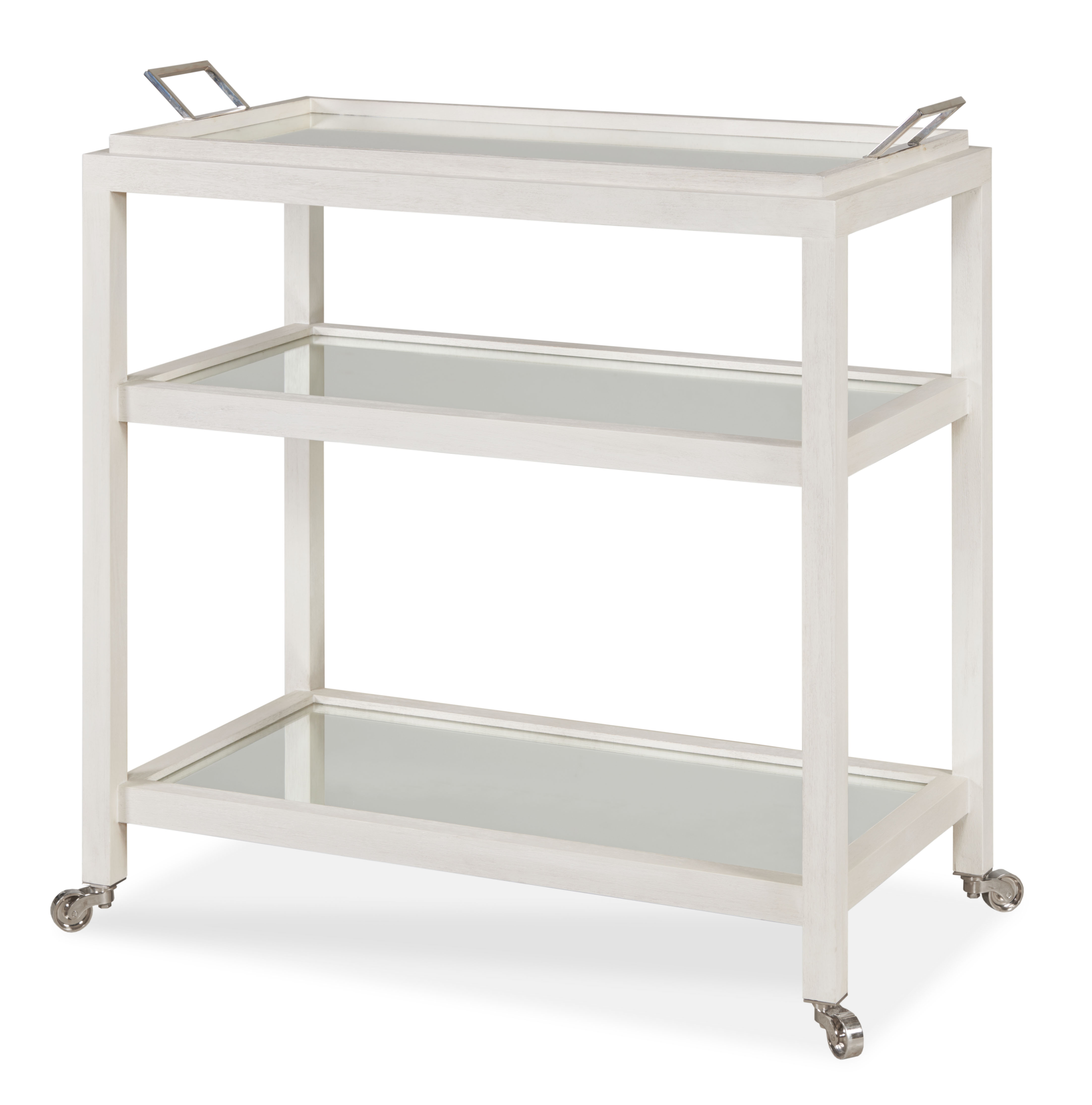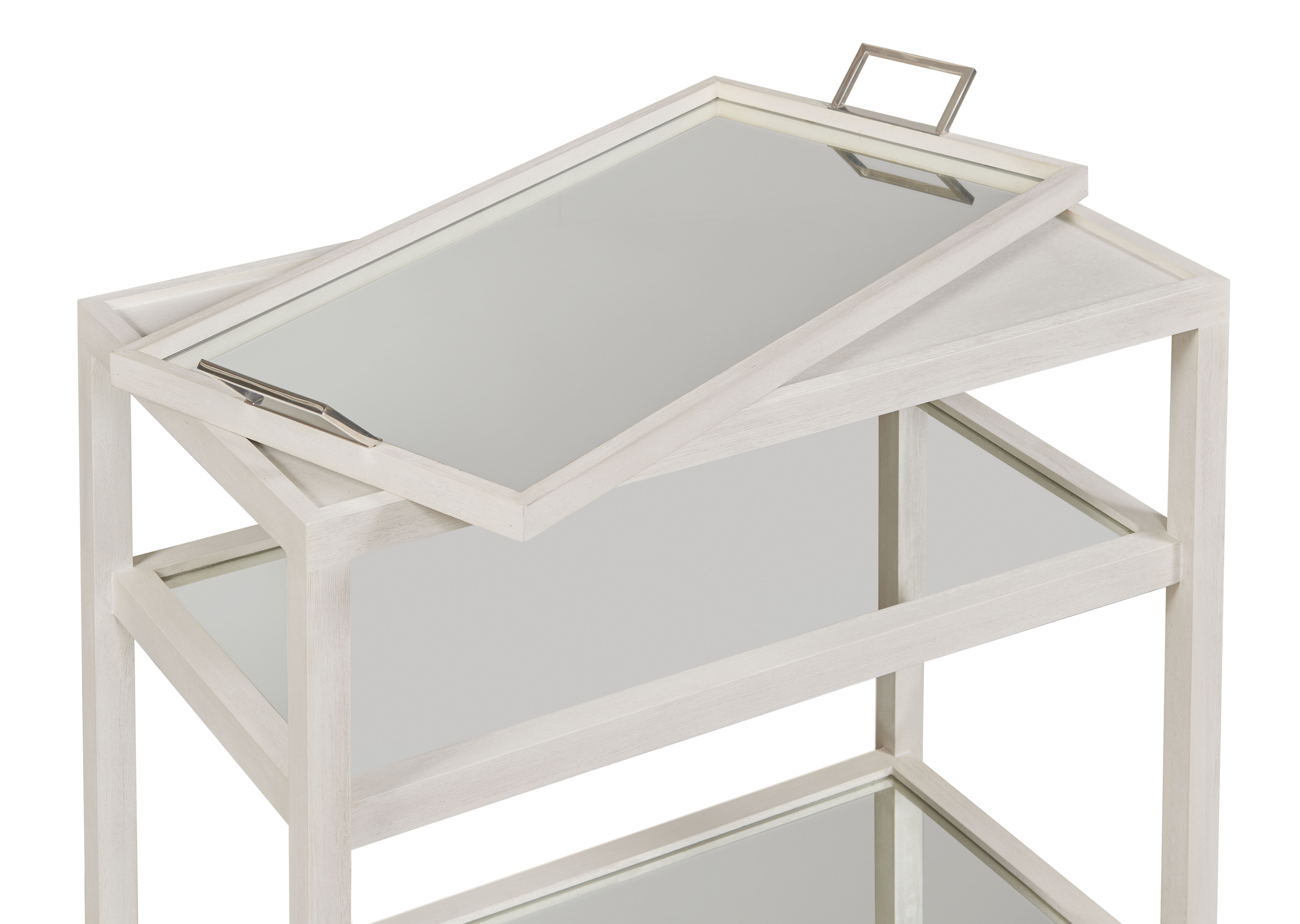 Finished in an off-white with removable tray and mirrored insert featuring polished nickel handles Two shelves with clear glass Silver antique finished casters |