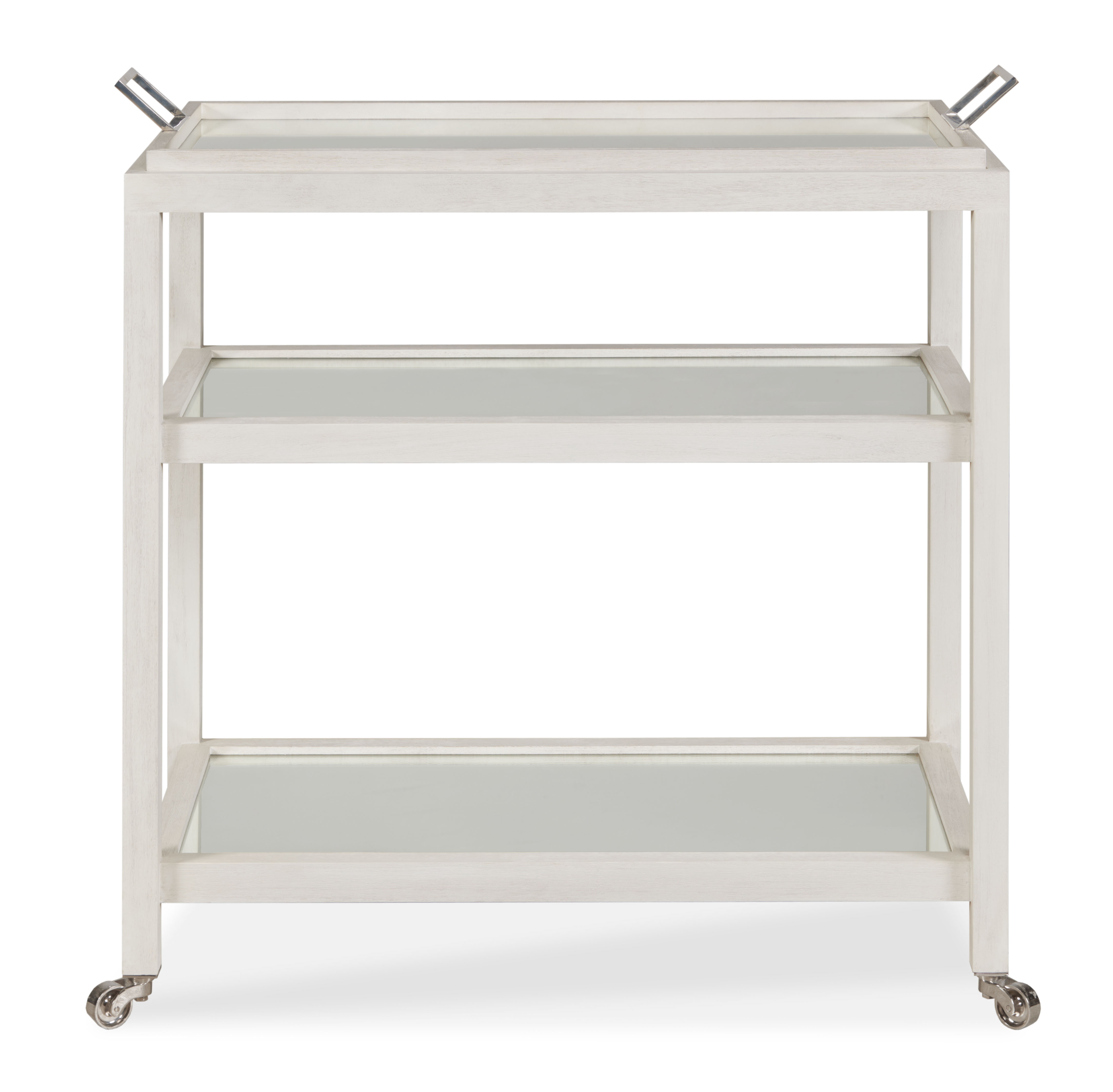 The Mandalay bar cart is a clean, functional entertainment piece. Polished nickel casters give this bar cart movability while two fixed shelves featuring mirrored insets and one removable top mirrored tray with nickel handles give it plenty of storage capacity for all of your barware and serving pieces.