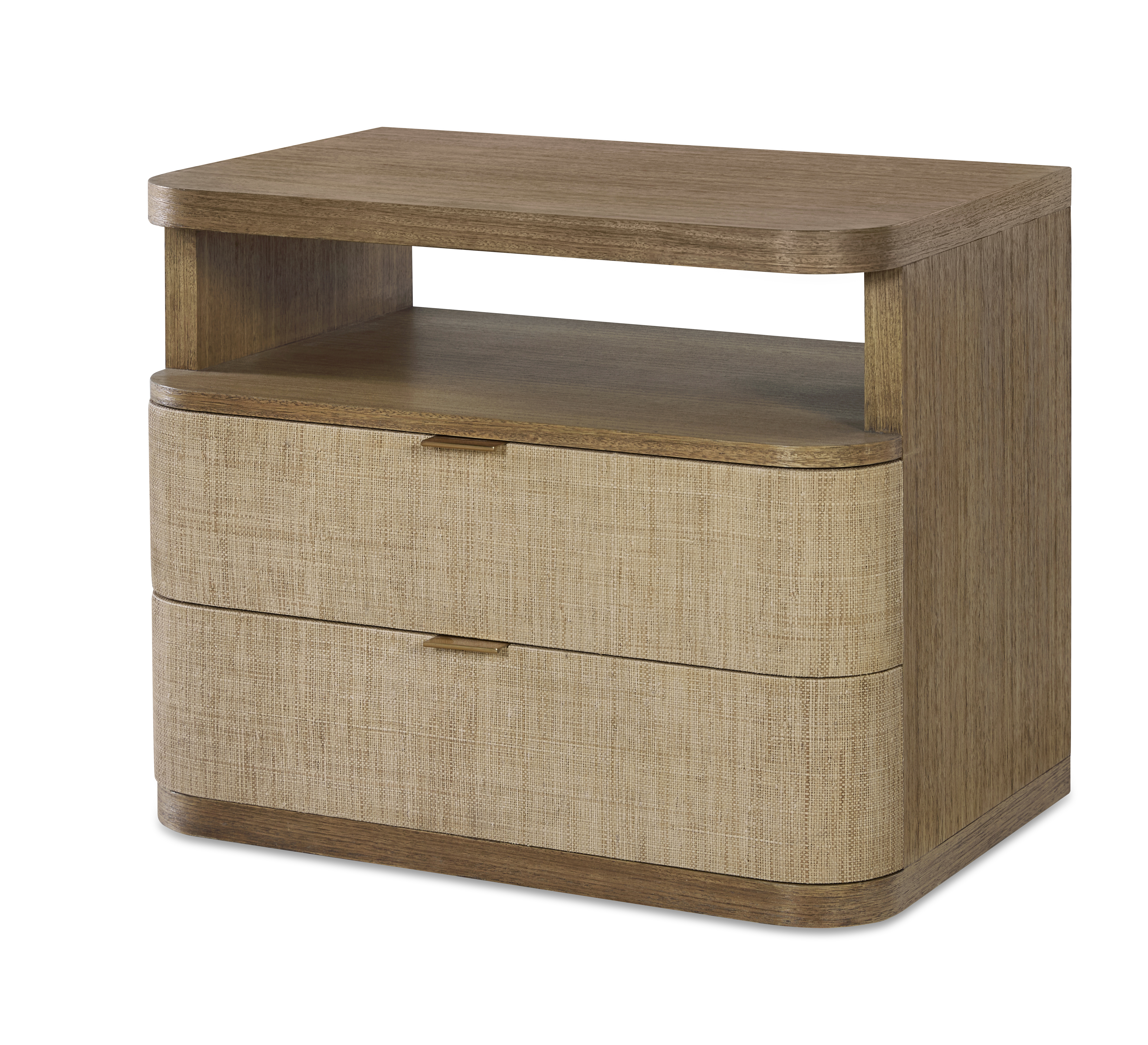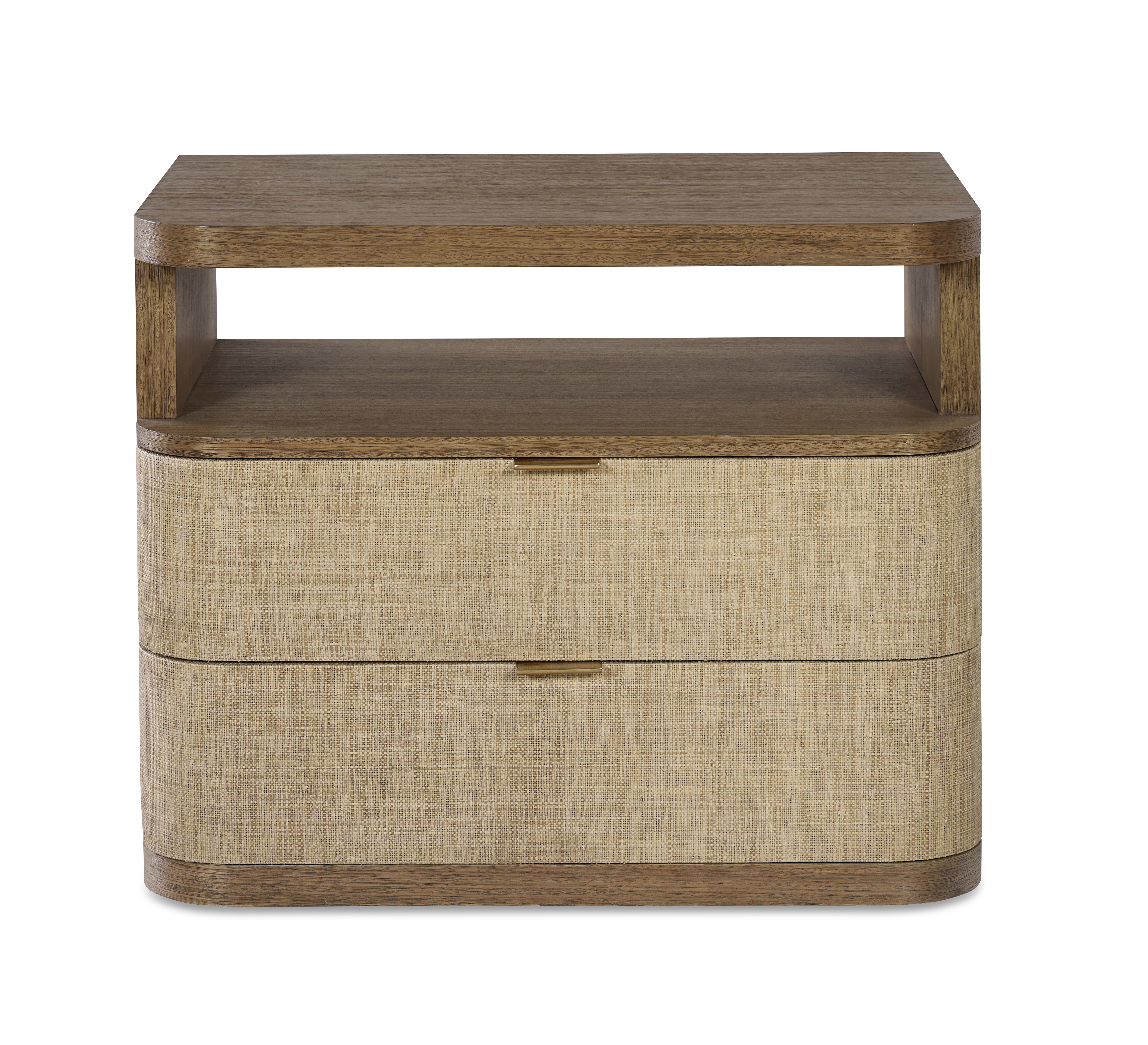 A warm, natural wood finish case with open storage above two drawers. Natural raffia drawer fronts with antique brass tab pull |
