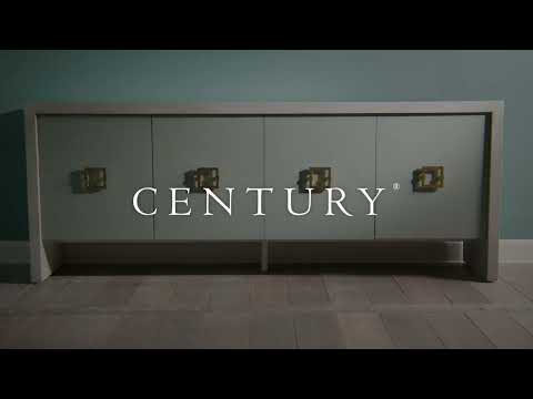 Liza credenza is a modernized Parson form finished in an off-white textured concrete contrasted with a white lacquer finish on the doors featuring Satin nickel hardware. Behind each set of two doors is one adjustable shelf, making it a wonderful storage piece.
