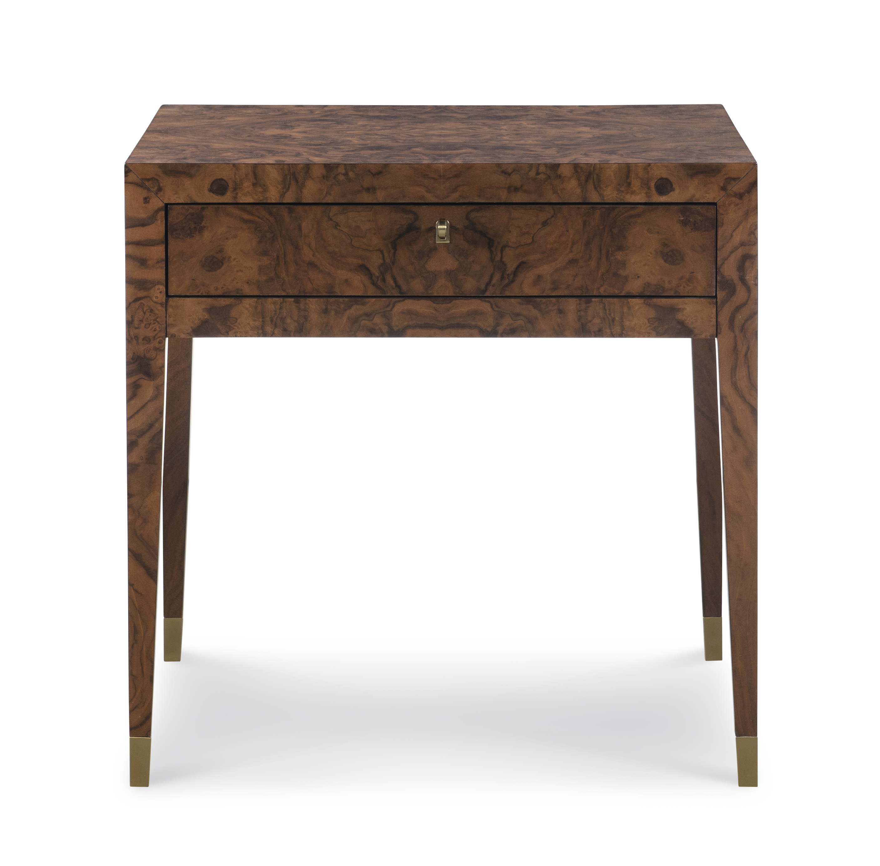 warm brown. One soft close drawer with brass trim key and keyhole hardware. Brass finish ferrules. |
