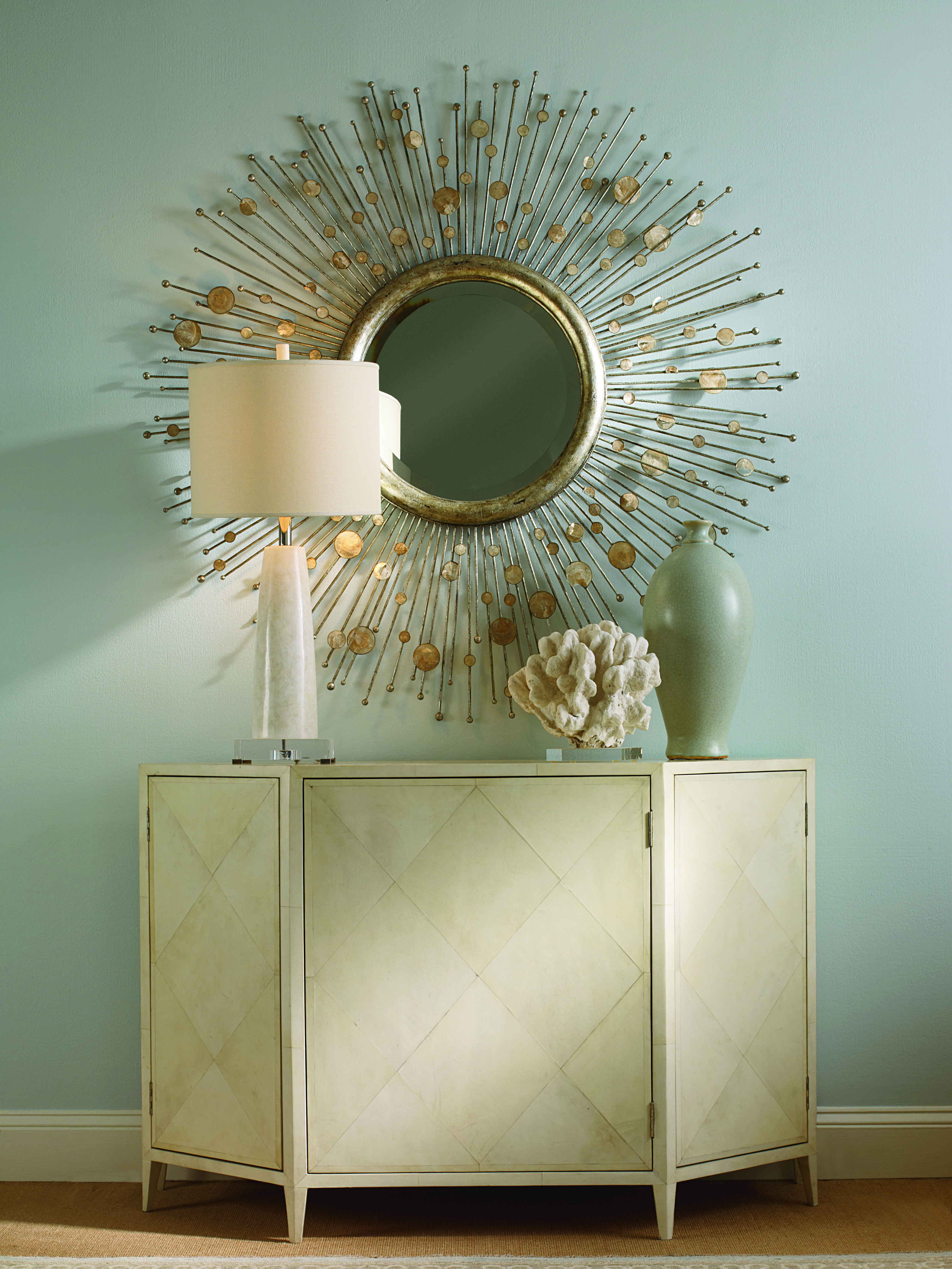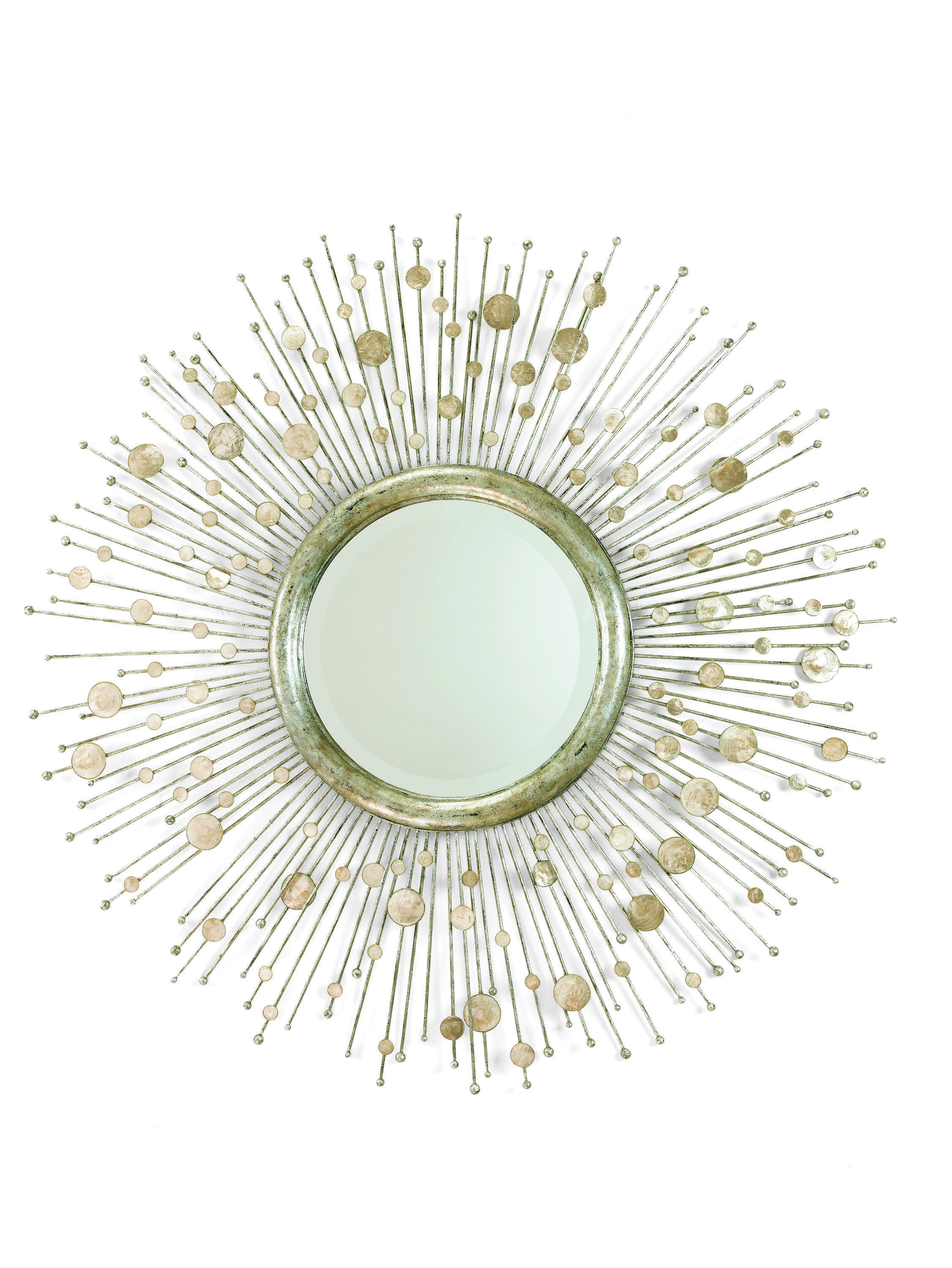 NOTE: AVAILABLE ONLY AS SHOWN **Limited Quantities Available** Silver antique finish on hardwood solids and wrought iron with inlaid capiz shell trim Beveled mirror Designed by Pride Sasser