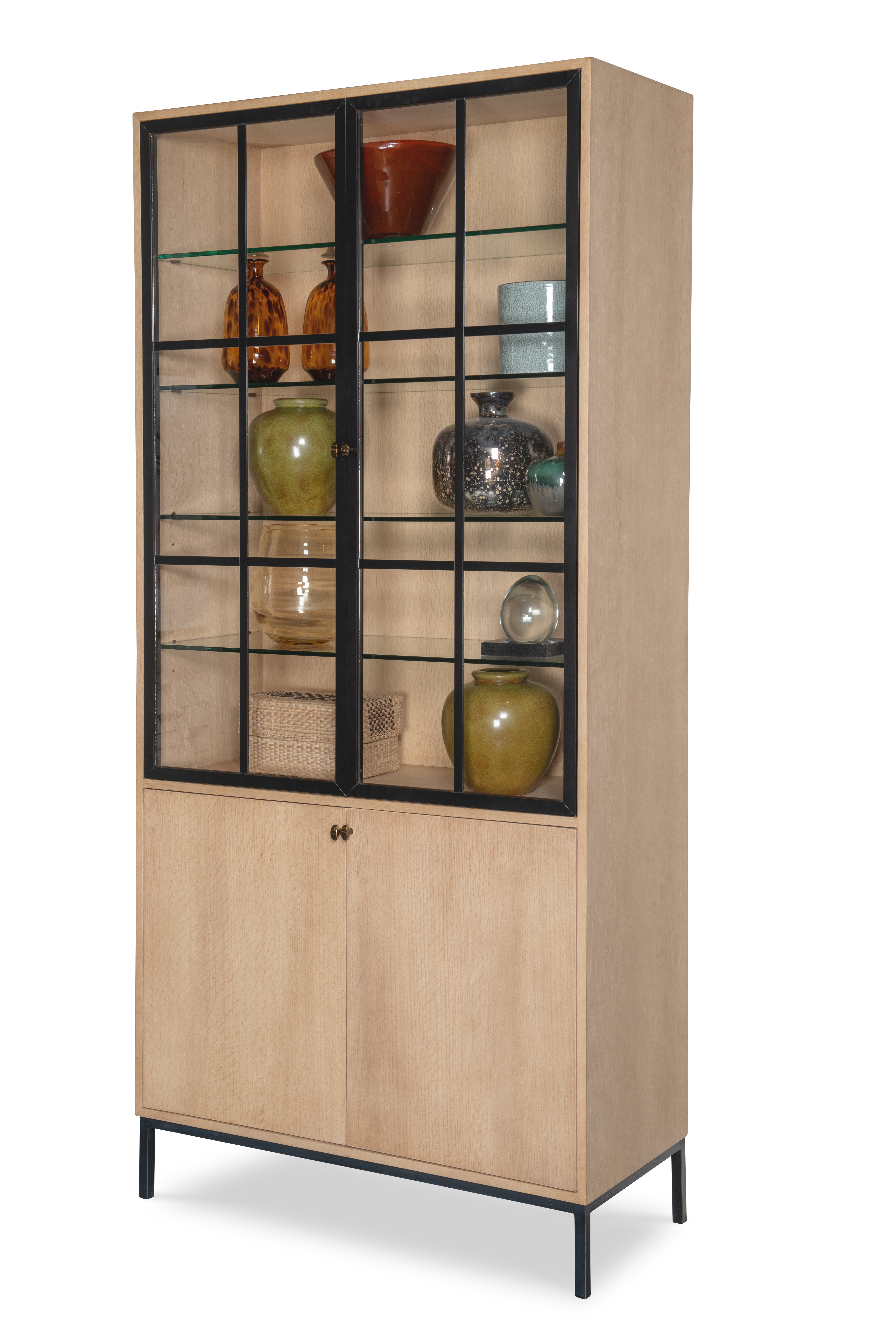 Oak solids and veneers finished in a light, natural stain. Behind a set of metal oil rubbed bronze doors is four adjustable glass shelves. Behind the bottom set of two doors is one adjustable shelf Oil rubbed bronze metal base Designed by Pride Sasser |