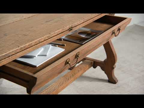 The Manning Flip-Top Console Table is crafted of Oak solids and veneer in a French Dry Oak finish. Two slightly splayed bases supported by a center stretcher support a top with a large center drawer that is embellished with two antique brass bail pulls. With both leaves open, the table has a 46" width, perfect for extra dining, and with the leaves closed it neatly tucks out of the way as a console.