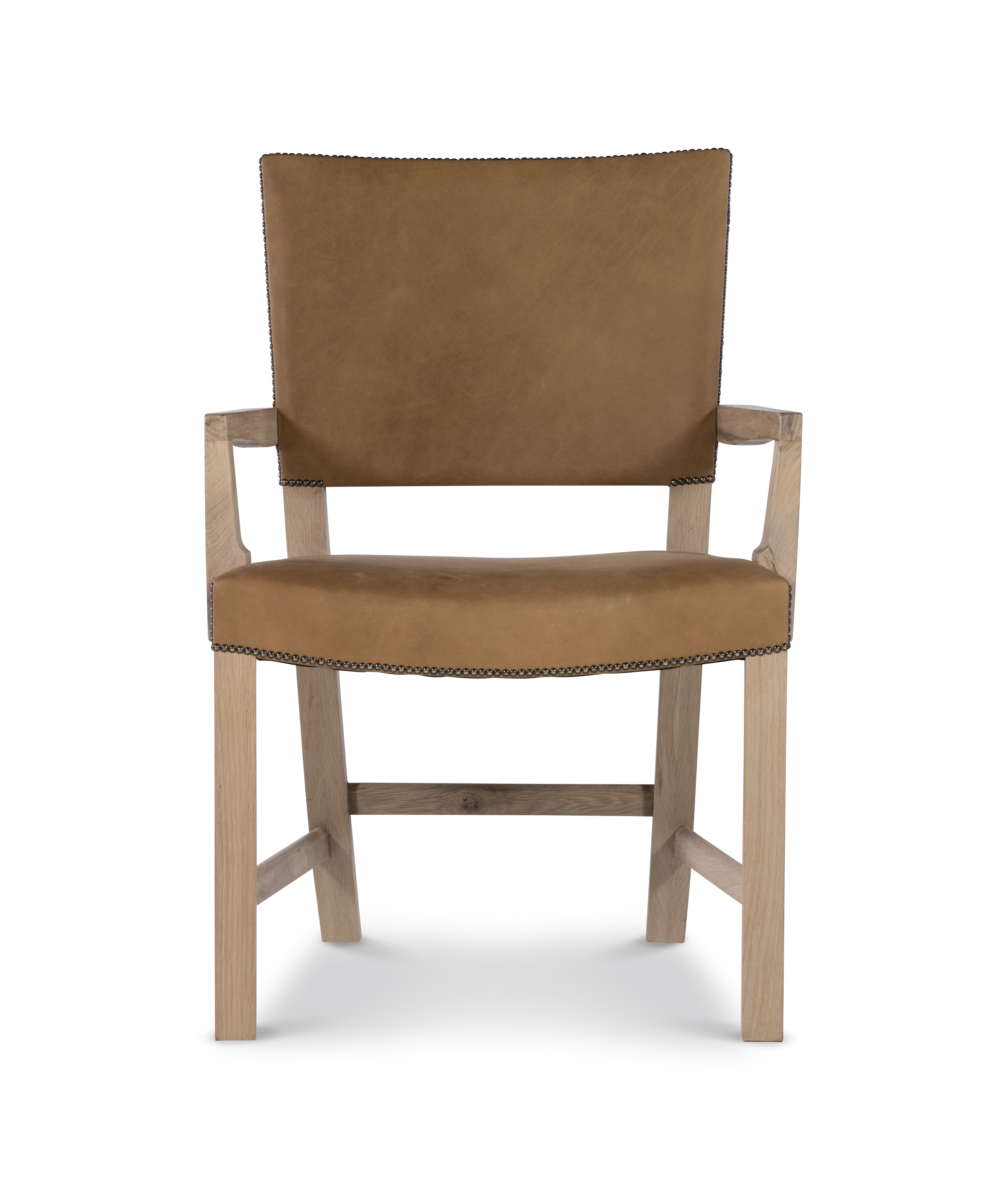 Oak solids finished in a light, natural stain. Camel colored leather with Bronze nailhead applied head to head around seat and inback/outback Designed by Pride Sasser |