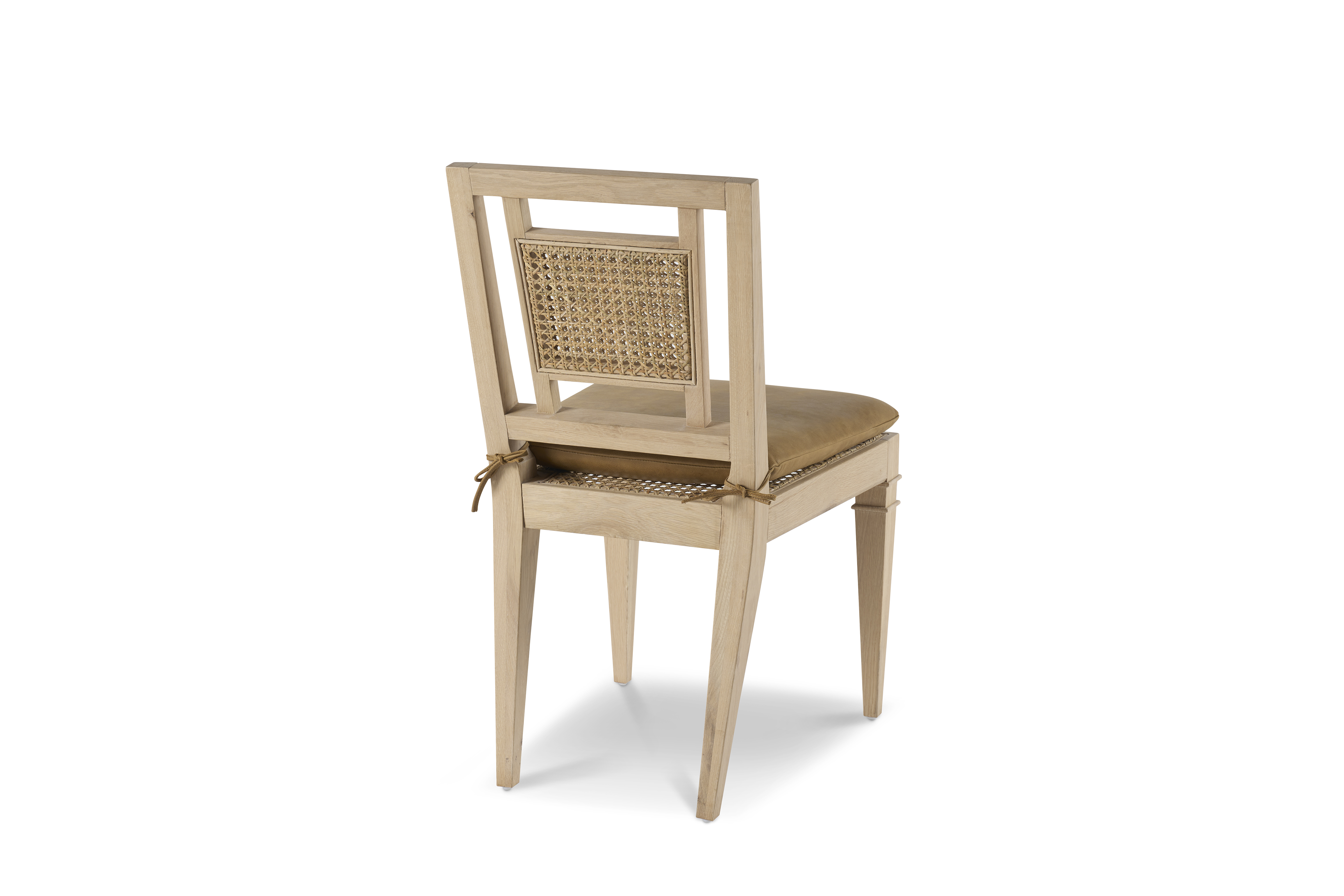 Oak solids finished in a light, natural stain. Seat and back in cane finished to match. Camel colored leather seat pad Please see SF6207-PAD for configurable fabrics/leathers Designed by Pride Sasser |