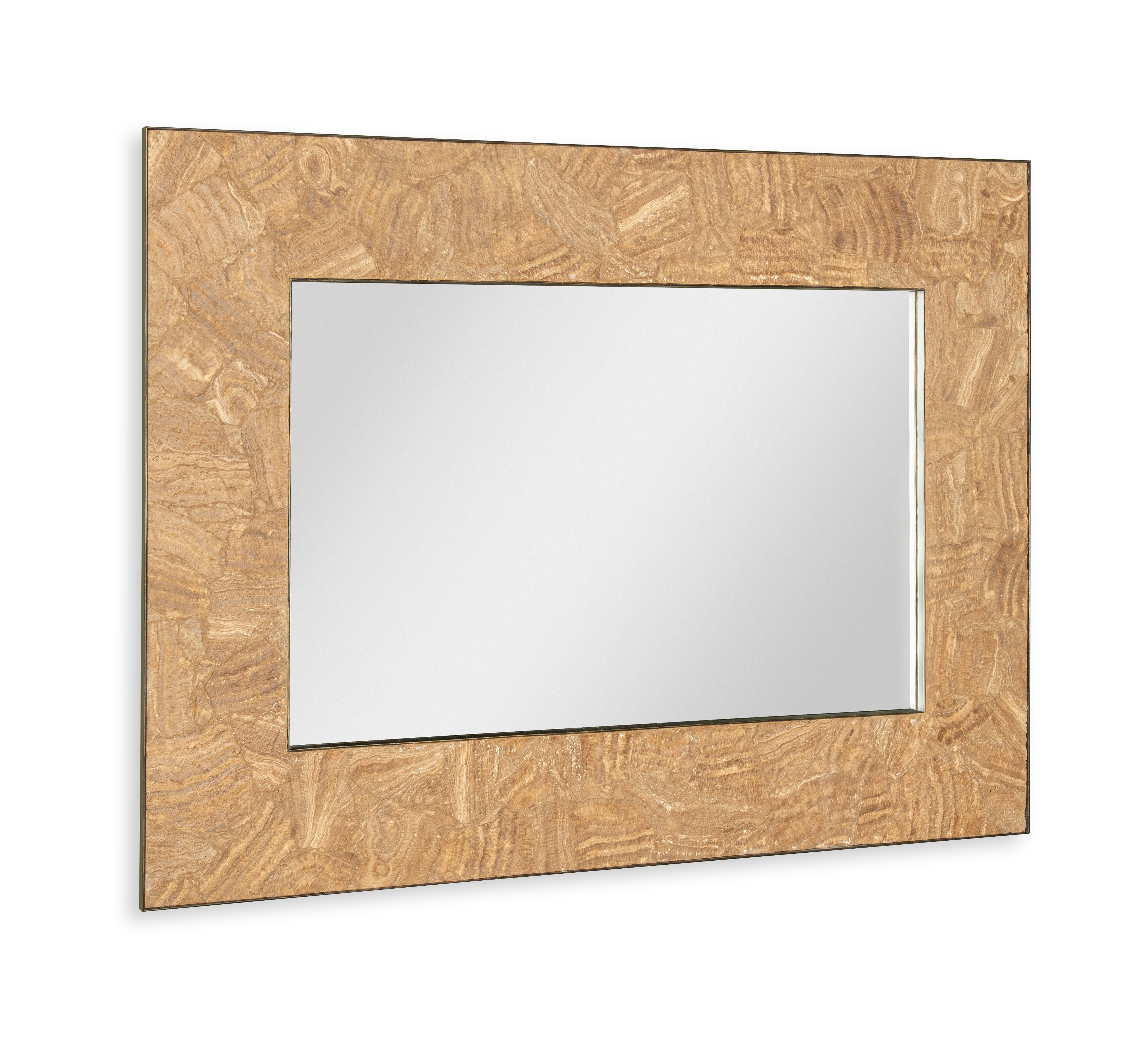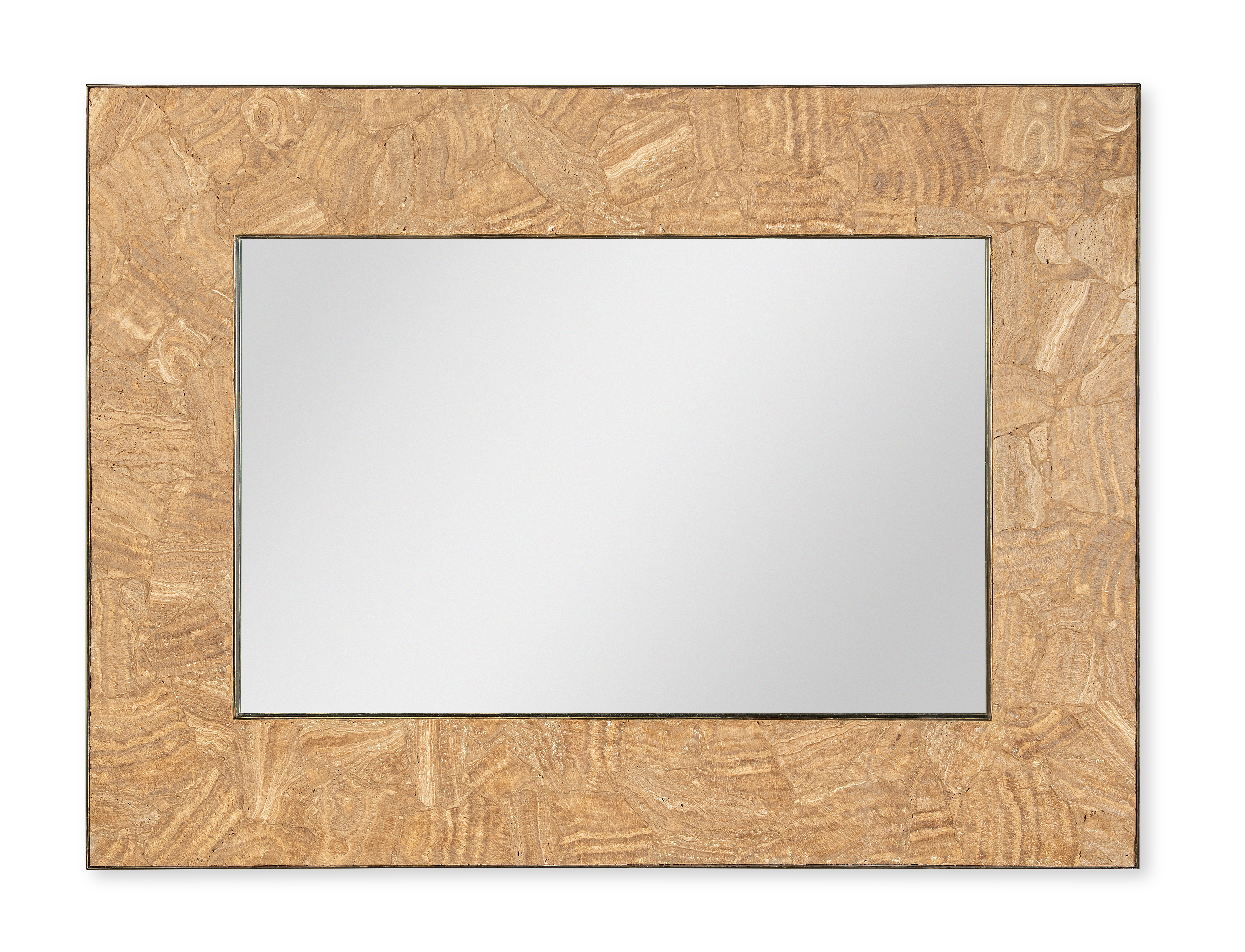 **Limited Quantities Available** Light toned travertine surrounding clear mirror with bronze metal framing Designed by Pride Sasser |