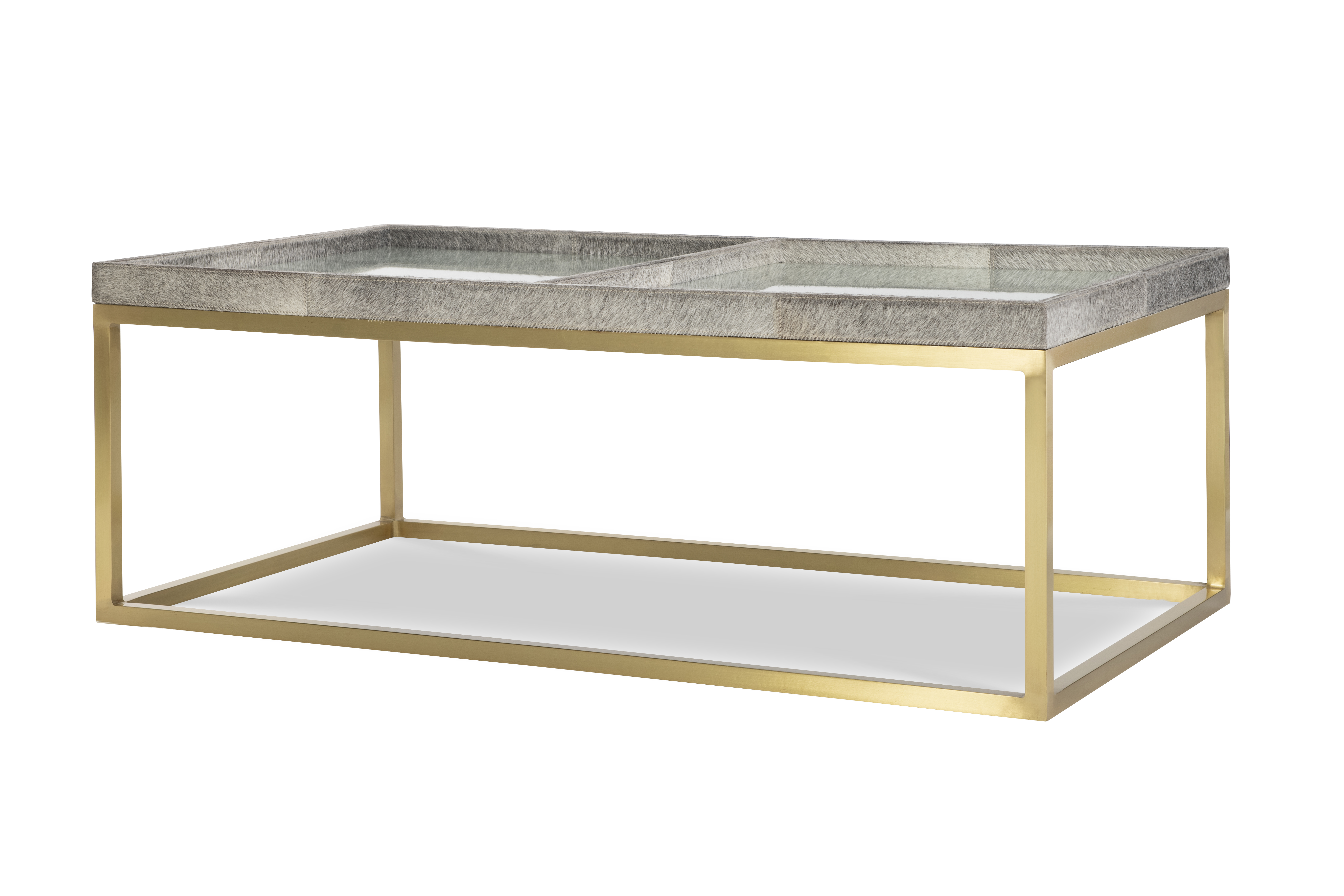 (View As Shown Info) Some color variation in photos of our furniture finishes and fabrics is possible due to the lighting and different color resolution on computer monitors. SF6222 - Falsom Coffee Table Grand Tour Furniture W: 50 in D: 28 in H: 19 in Add Item to Wishlist Product Details Material Upholstery, Metal, Glass Notes **Limited Quantities Available**PLEASE NOTE: Hair-On-Hide is a 100% natural product, it will vary in shade, hair lengthGrey hair-on-hide with clear glass inset top on satin brass base Dimensions Product Care Dealer Locator