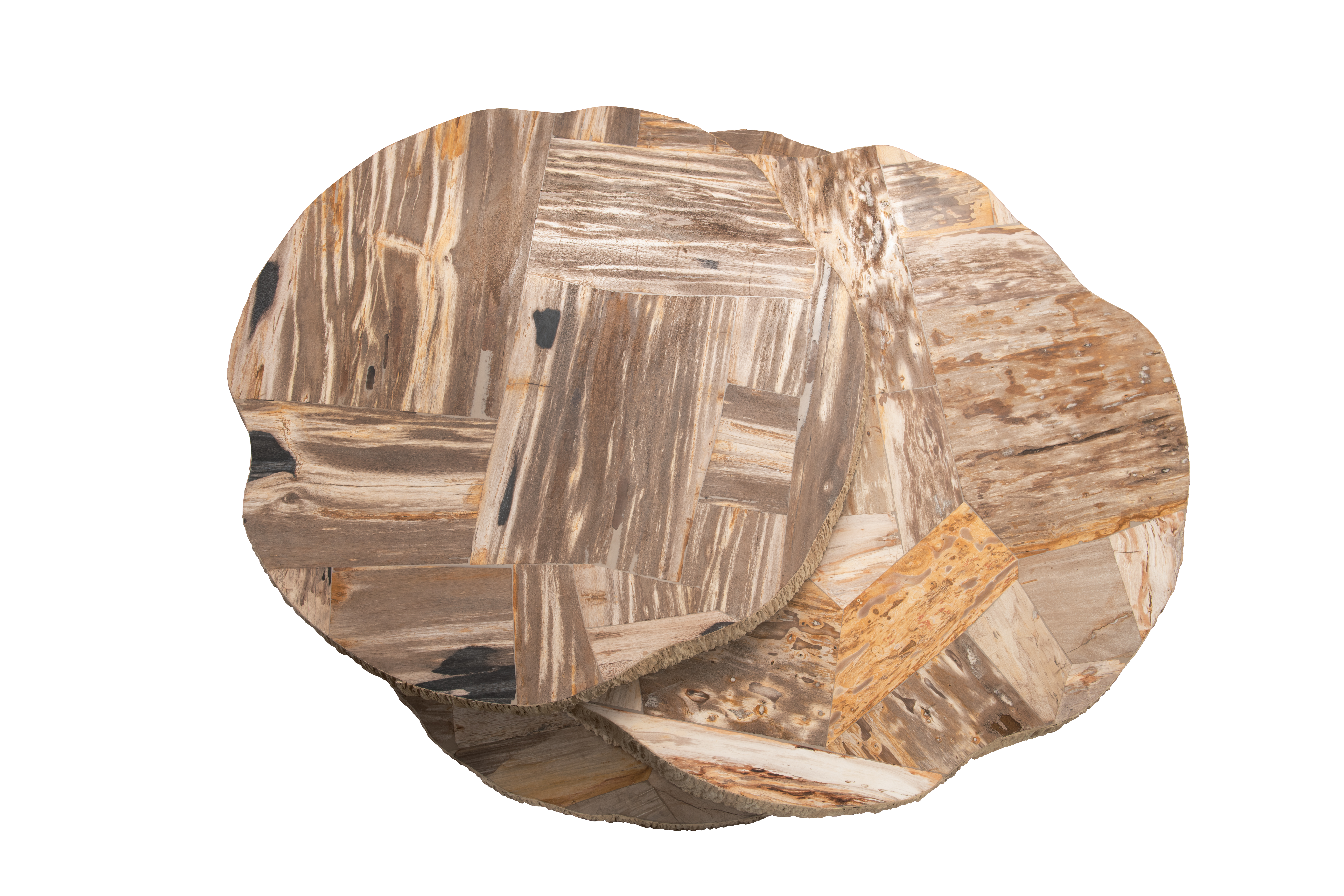 This unique cocktail table is a sculptural masterpiece, crafted from stacked slices of naturally petrified wood. The organic shapes and textures of the fossilized wood create a visually stunning centerpiece, adding a touch of ancient artistry to your living space. Each slice tells a story, making this table a captivating conversation starter and a testament to the beauty of natural materials.