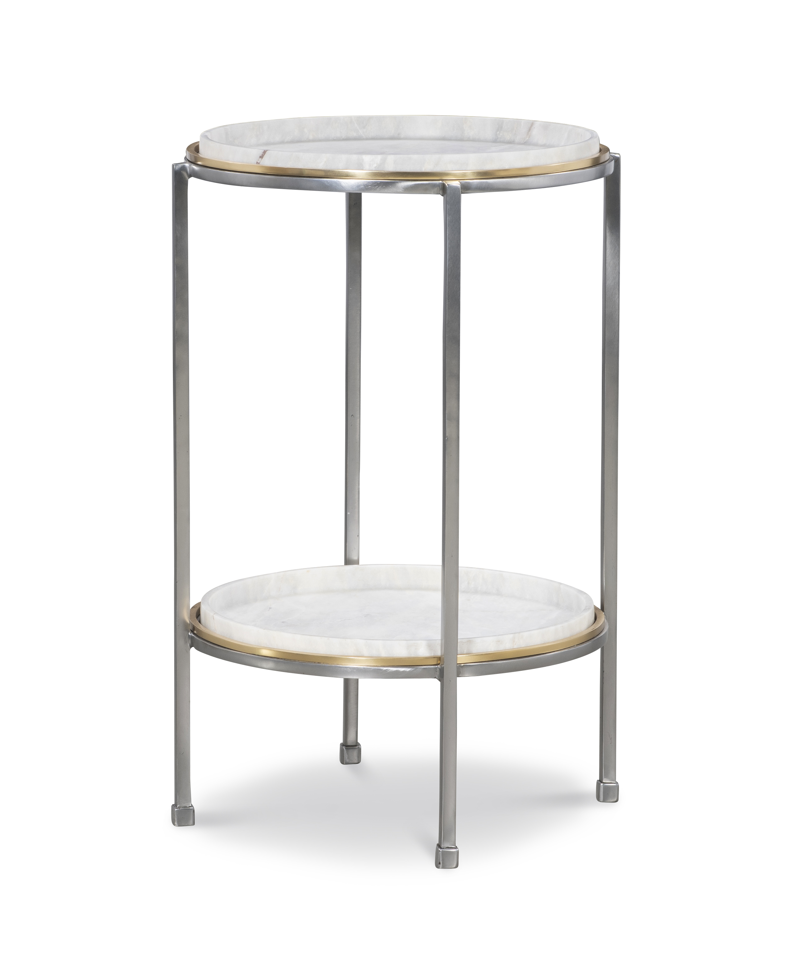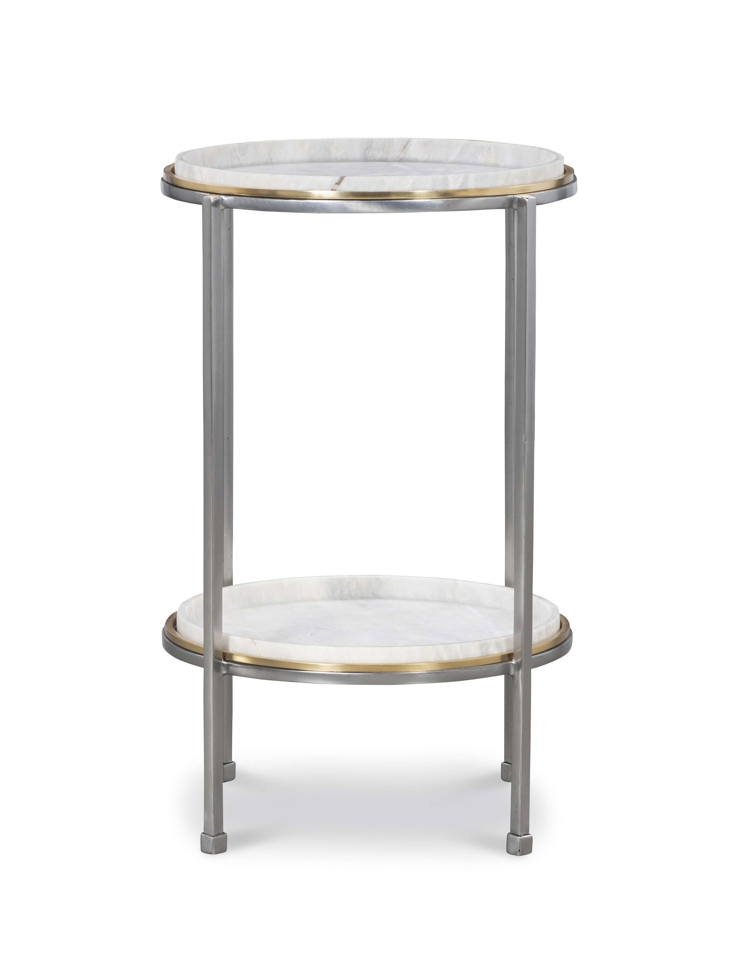 **Limited Quantities Available** Satin finish shaped marble top and shelf with Polished steel base and Brass accent Designed by Pride Sasser |