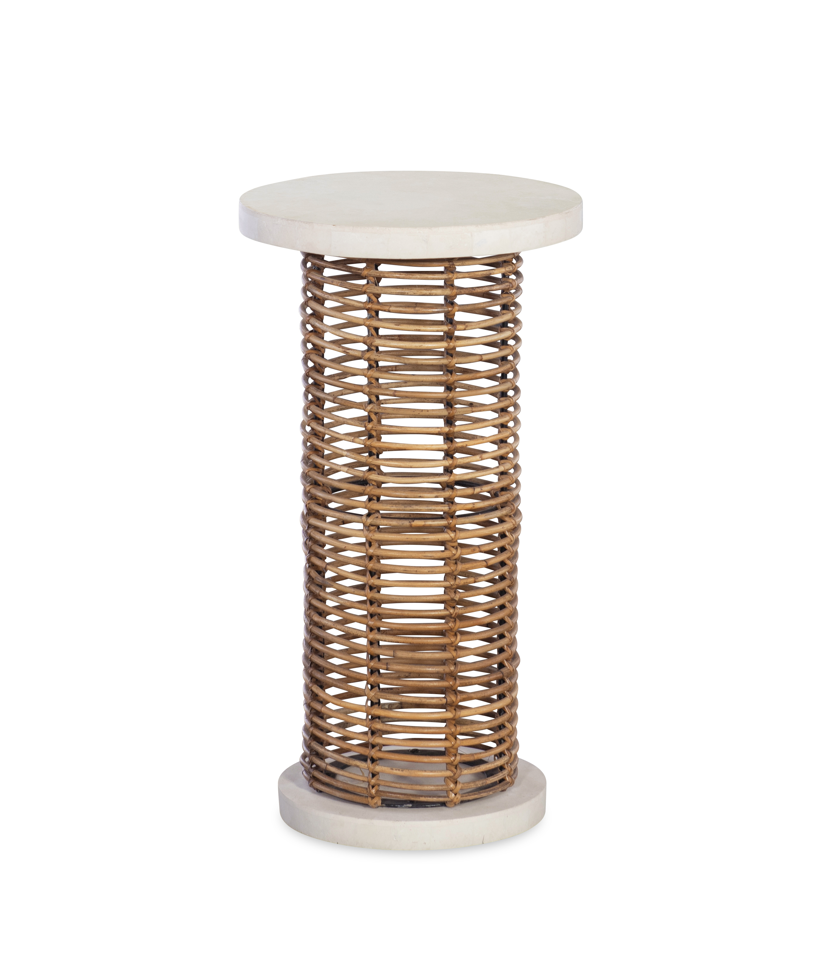**Limited Quantities Available** White agate stone top and base with rattan accent |