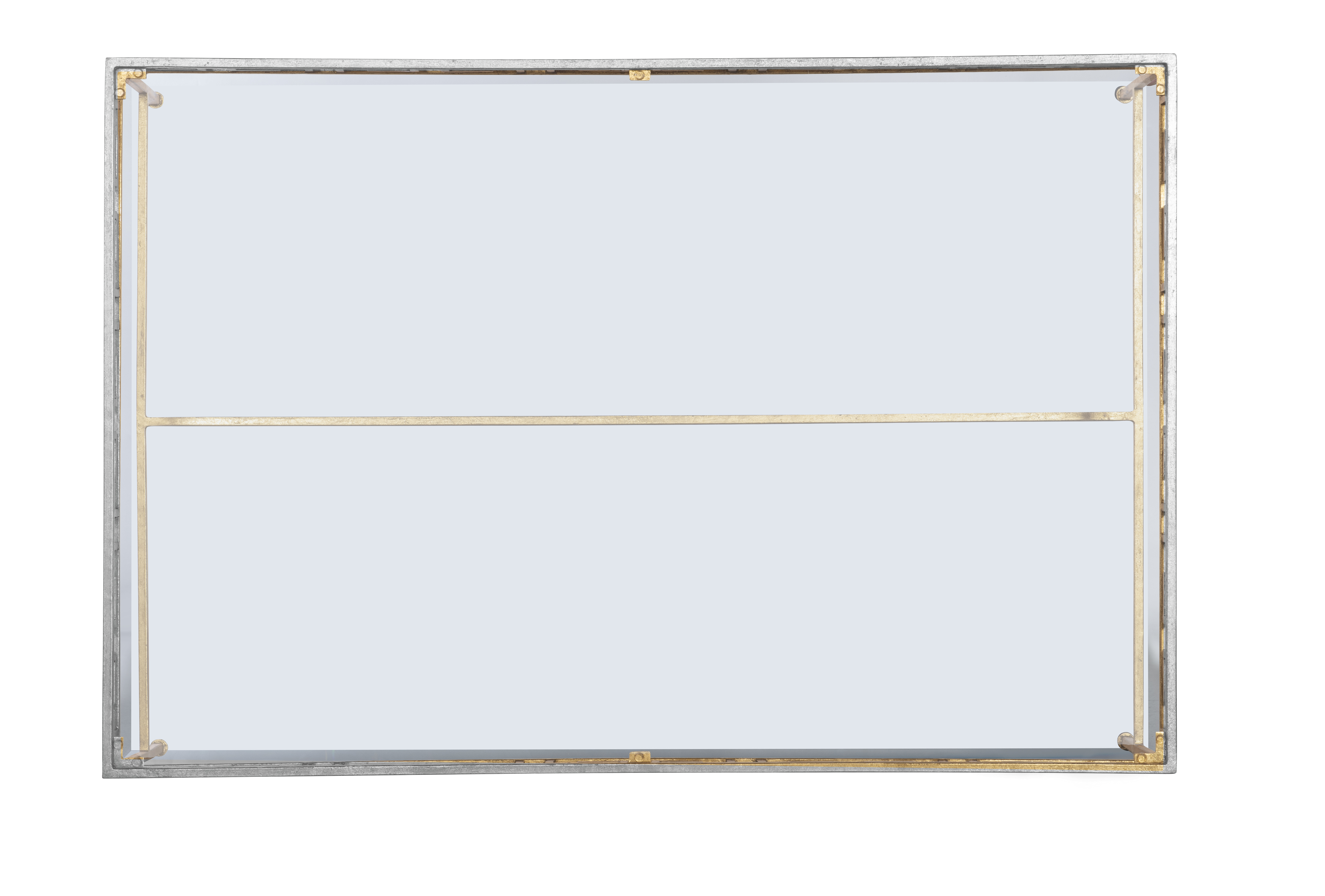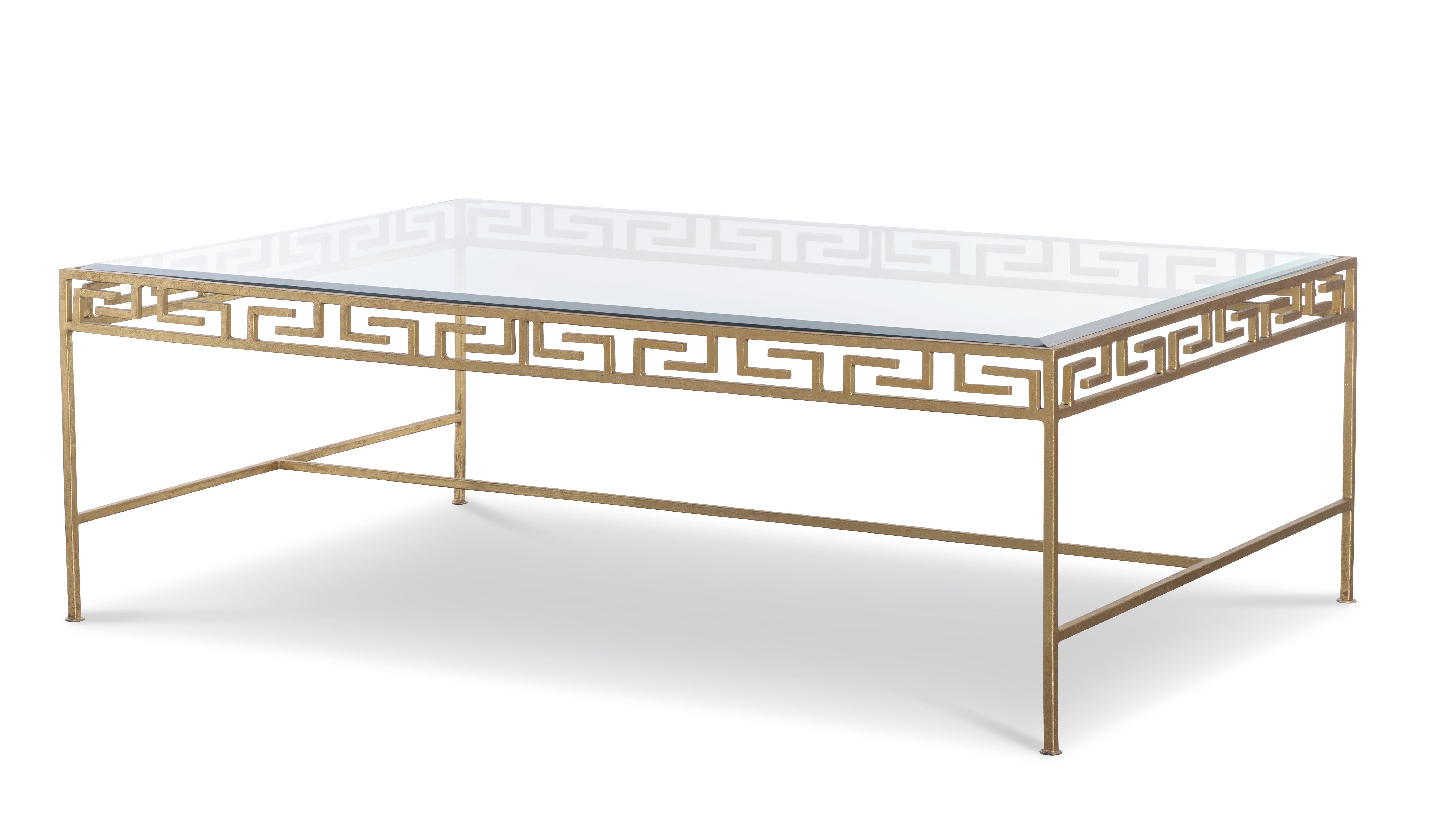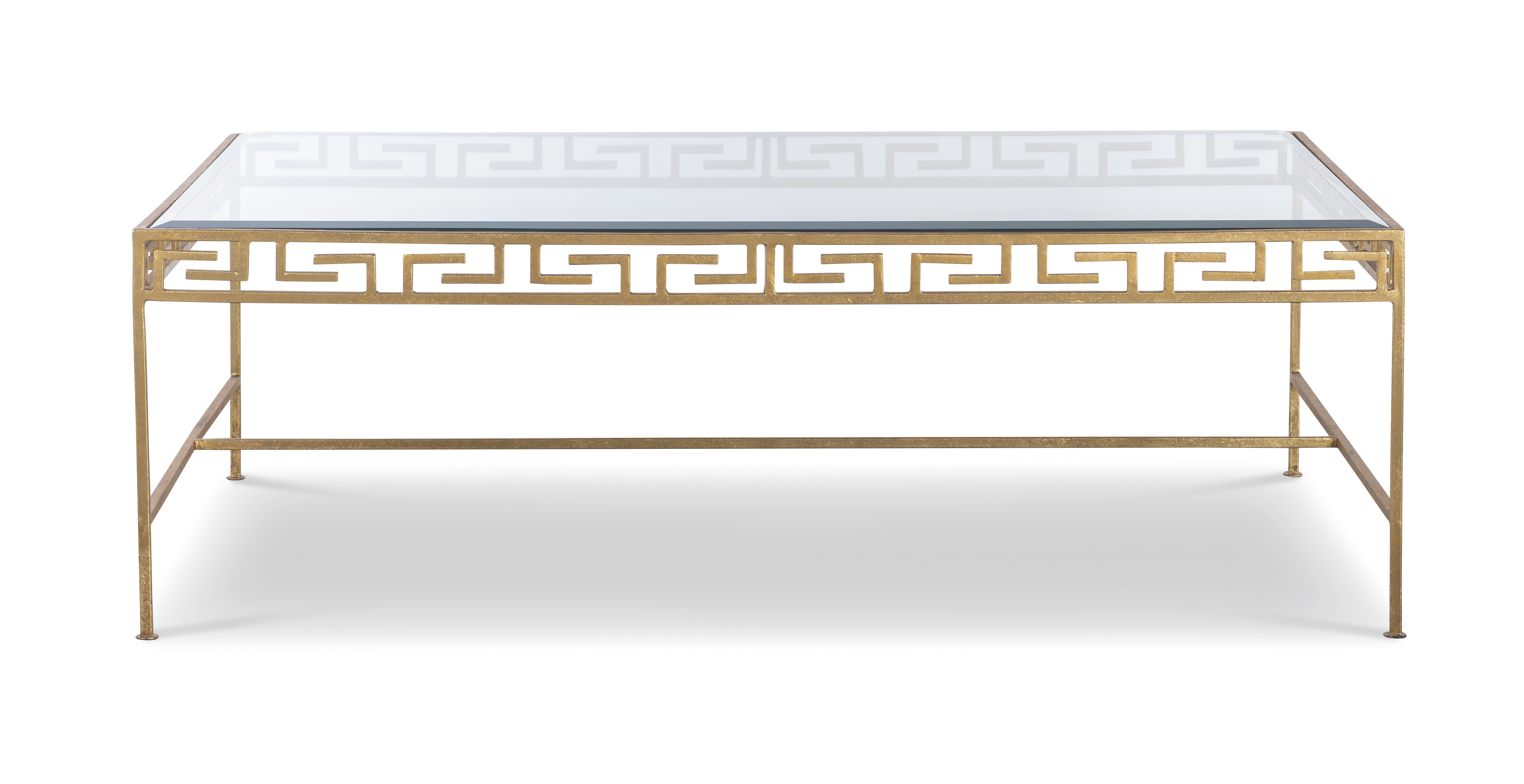 Gold leaf finish on iron base with stretcher and glass top |
