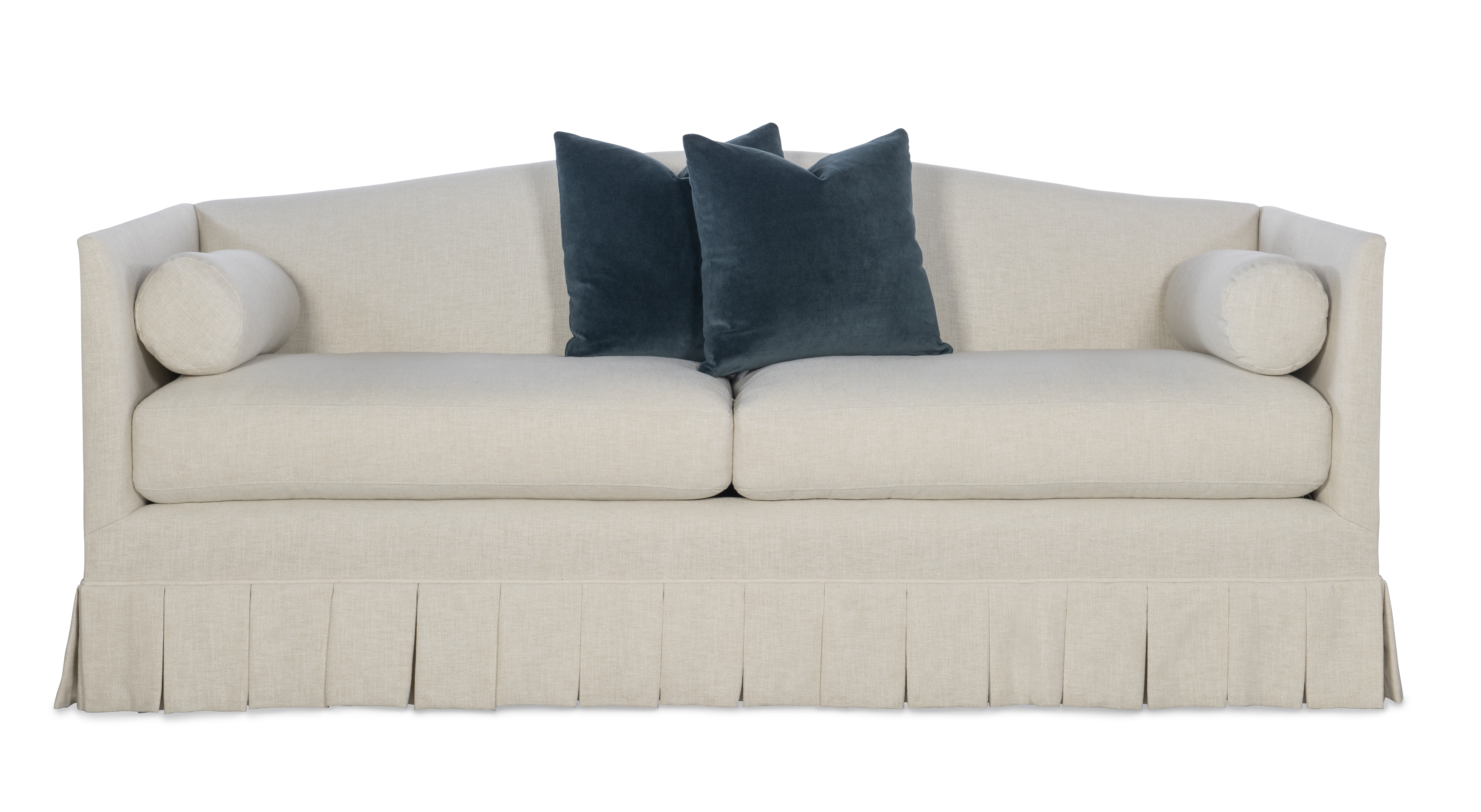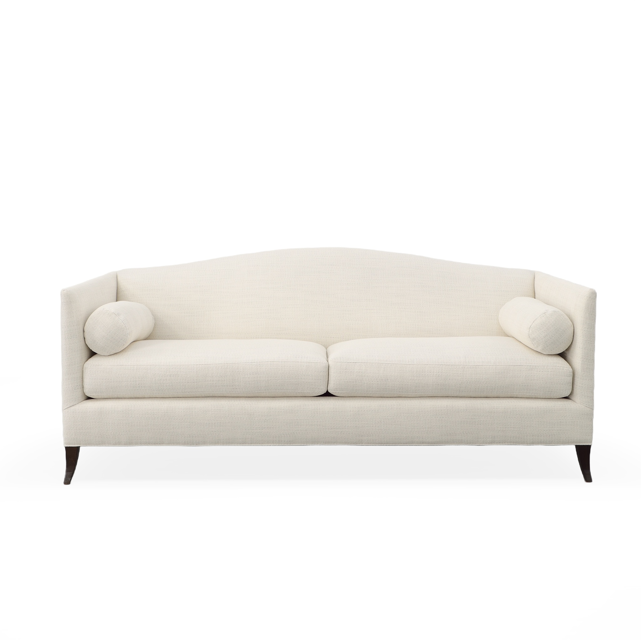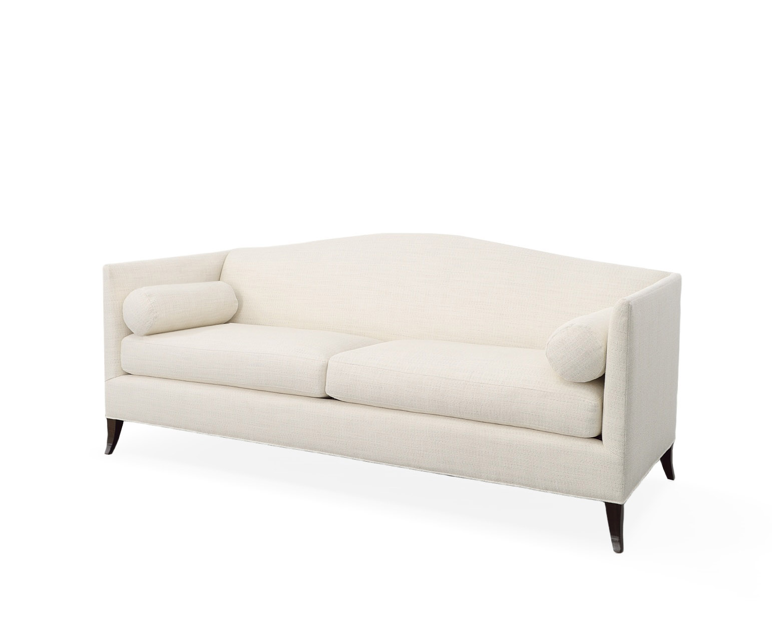 The Lennox Sofa features a thin tapered shelter arm that flows into an arched tight back with sweeping tapered legs. Standard with eight way hand tied construction, two seat cushions and two round arm bolsters.