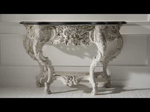 Inspired by an 18th Century Louis XV elaborately carved console with a black honed marble top exemplifies the Rococo style's emphasis on ornate and fluid designs,